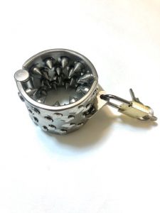 本日はたっぷりのペニス責め。まずは痛い棘のついたリングを根元に留めてブジー責め。